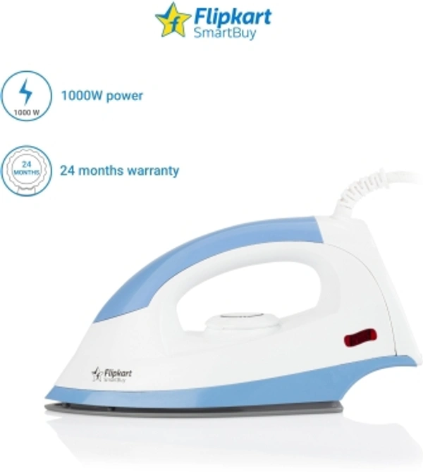 Flipkart SmartBuy 1000 W Dry IronColor: Blue, White, Grey, WhiteDry IronNon Stick Coated PlateConsumes 1000 W7 Days Replacement Policy, No questions asked