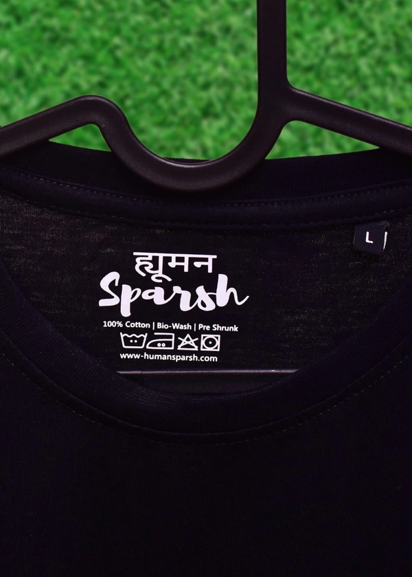 *Human Sparsh Men’s Round Neck T-Shirt – Black*Power, Elegance and Sophistication is what you’ll feel when Black is worn. It would show how deep and serious the feelings and thoughts are.Whether you wear it with Jeans or Track Pants, you’ll look great with it.It’s made up of 180 gsm 100% Bio-Washed Cotton fabric with the most durable stitching to make sure it lasts long without los