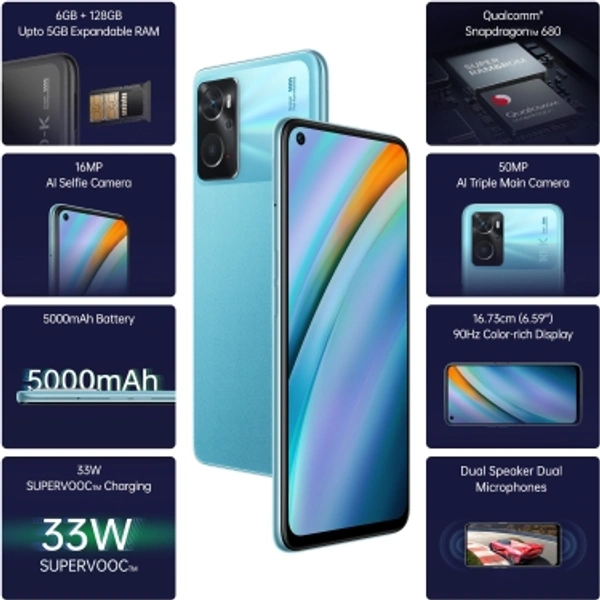 OPPO K10 (Blue Flame, 128 GB)Color: Black Carbon, Blue FlameRAM: 6 GB, 8 GB6 GB RAM | 128 GB ROM | Expandable Upto 1 TB16.74 cm (6.59 inch) Full HD+ Display50MP + 2MP + 2MP | 16MP Front Camera5000 mAh Lithium Ion BatteryQualcomm Snapdragon 680 Processor33W SUPERVOOC Charger | Dual Speaker | Super Adaptive Refresh RateAI Photo Suite | OPPO Glow Design with Dirt and Scratch Resistant
